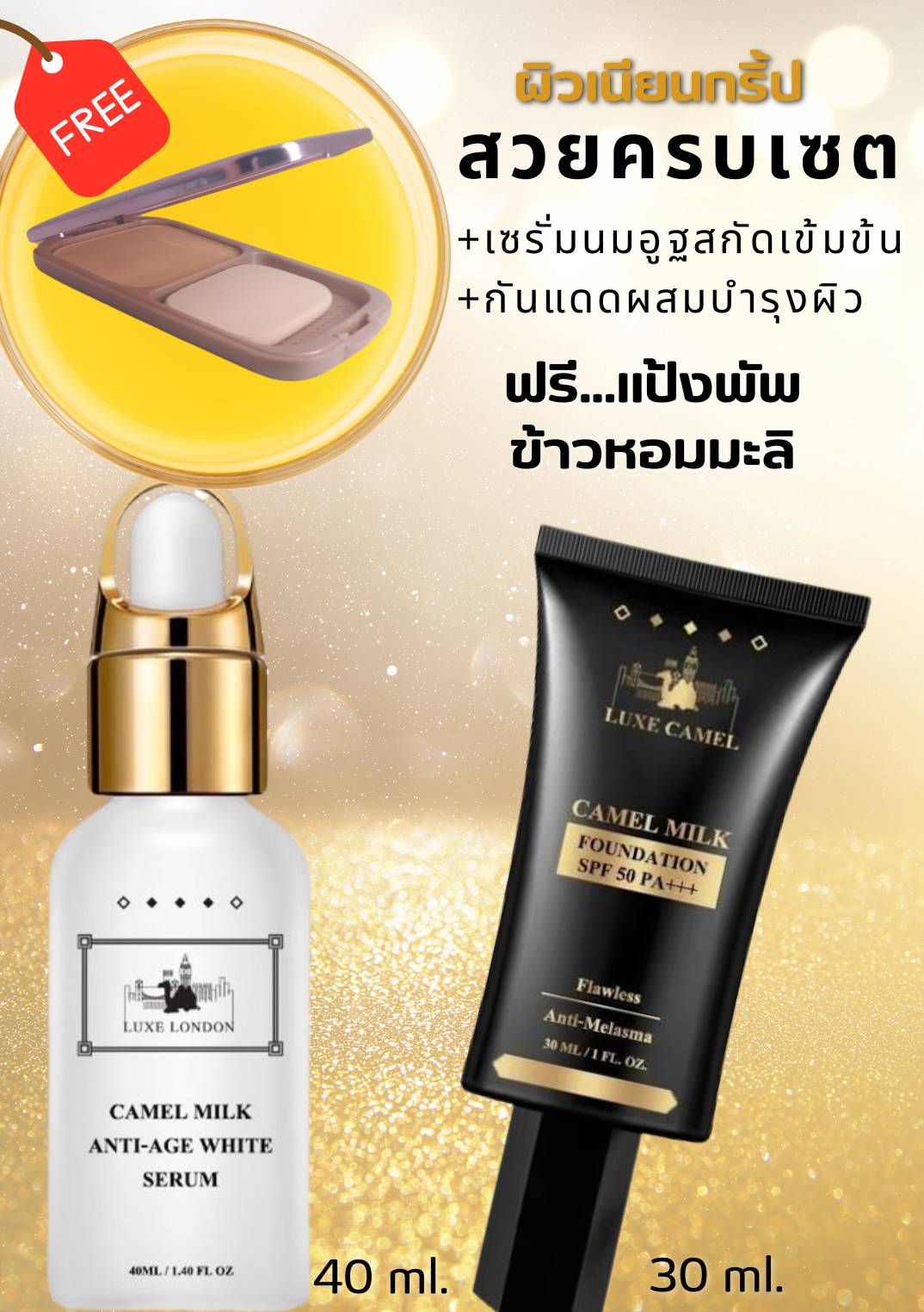 เซรั่มน้ำนมอูฐเข้มข้น CAMEL MILK BOOSTER SERUM + กันแดดน้ำนมอูฐ LUXE CAMEL + แถมฟรีแป้งพัพข้าวหอมมะลิ